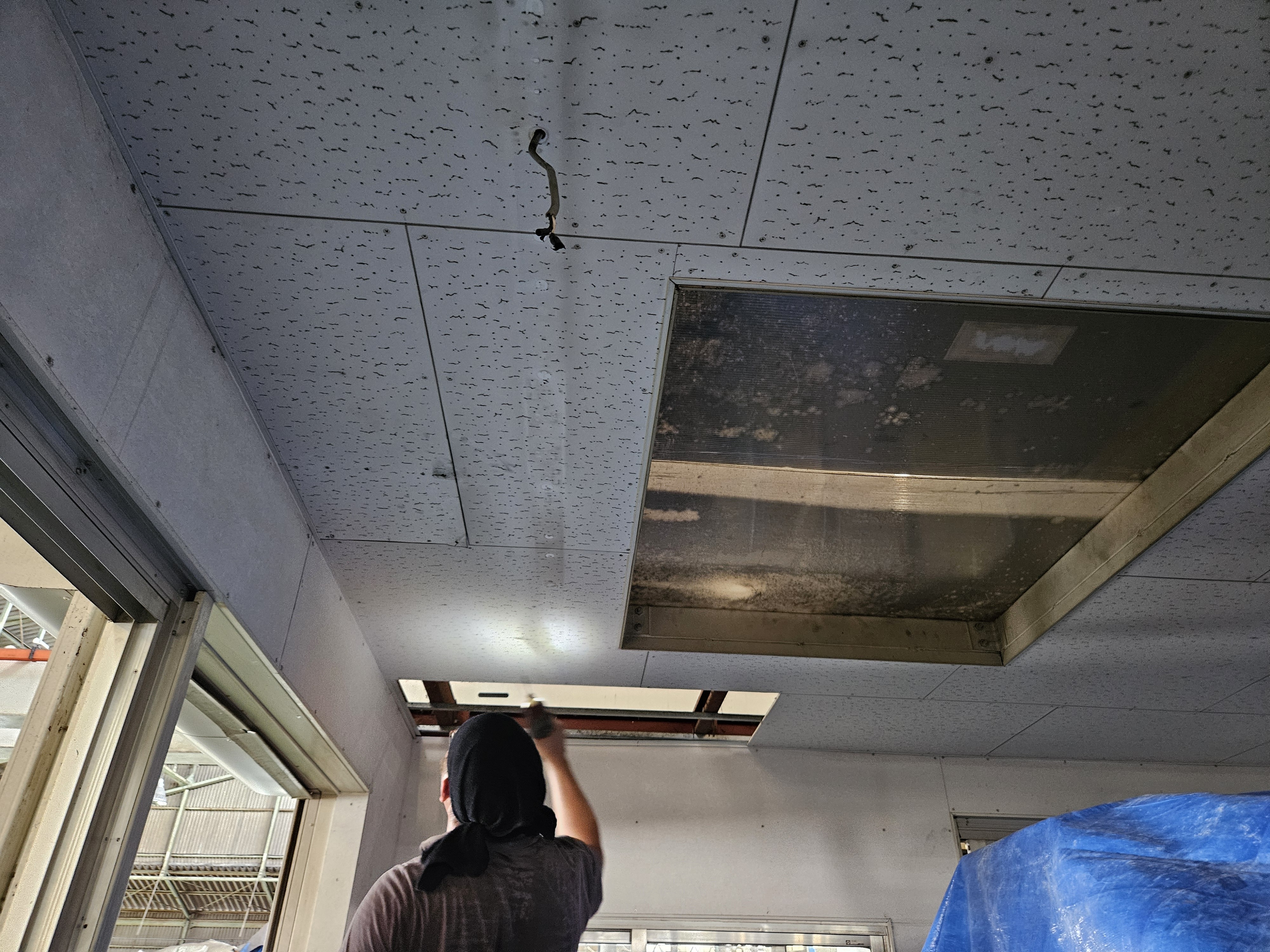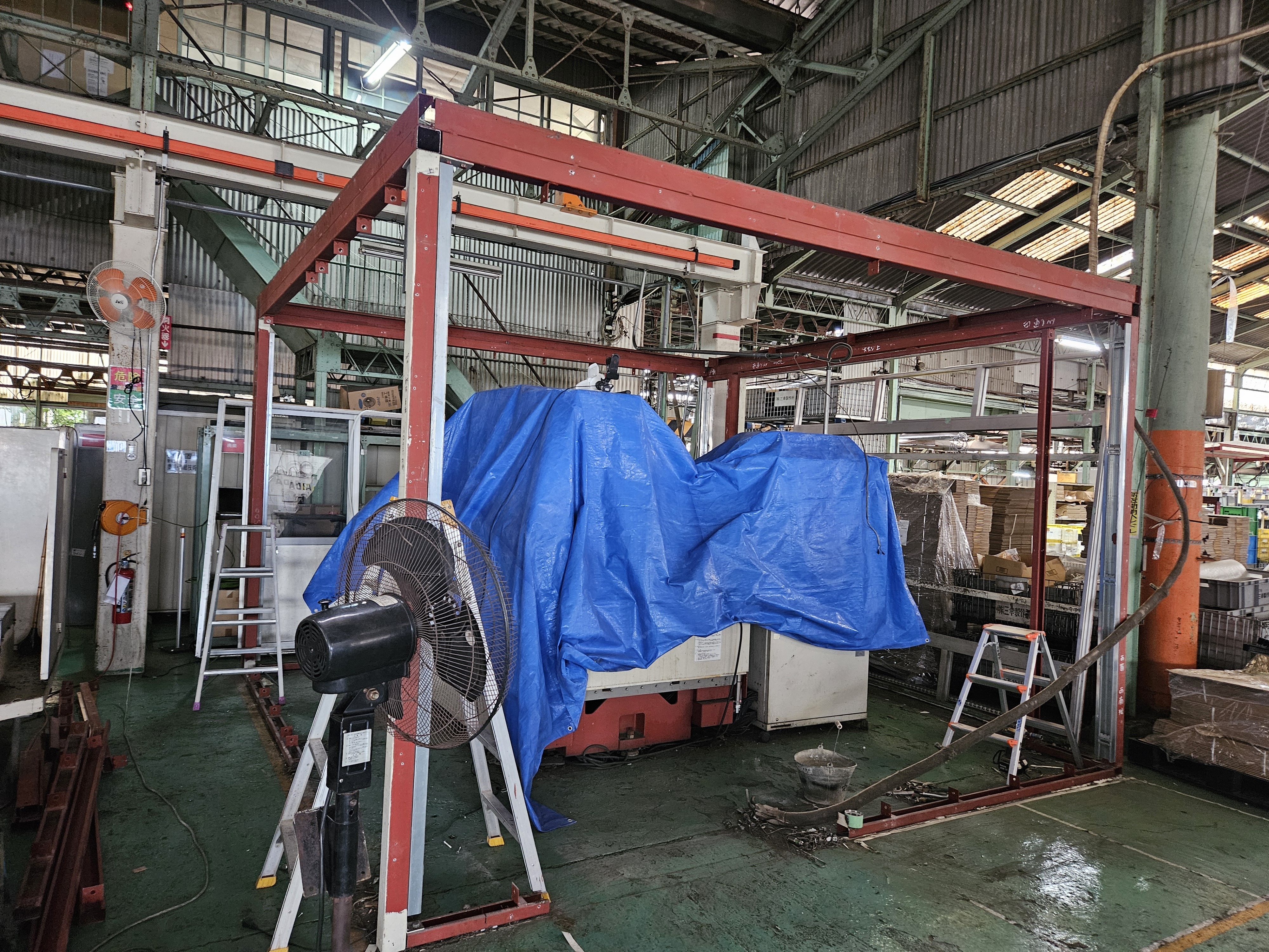 室内に検査機械がある状態での作業となるのでシートで養生し損傷させないよう気を付けての解体です。