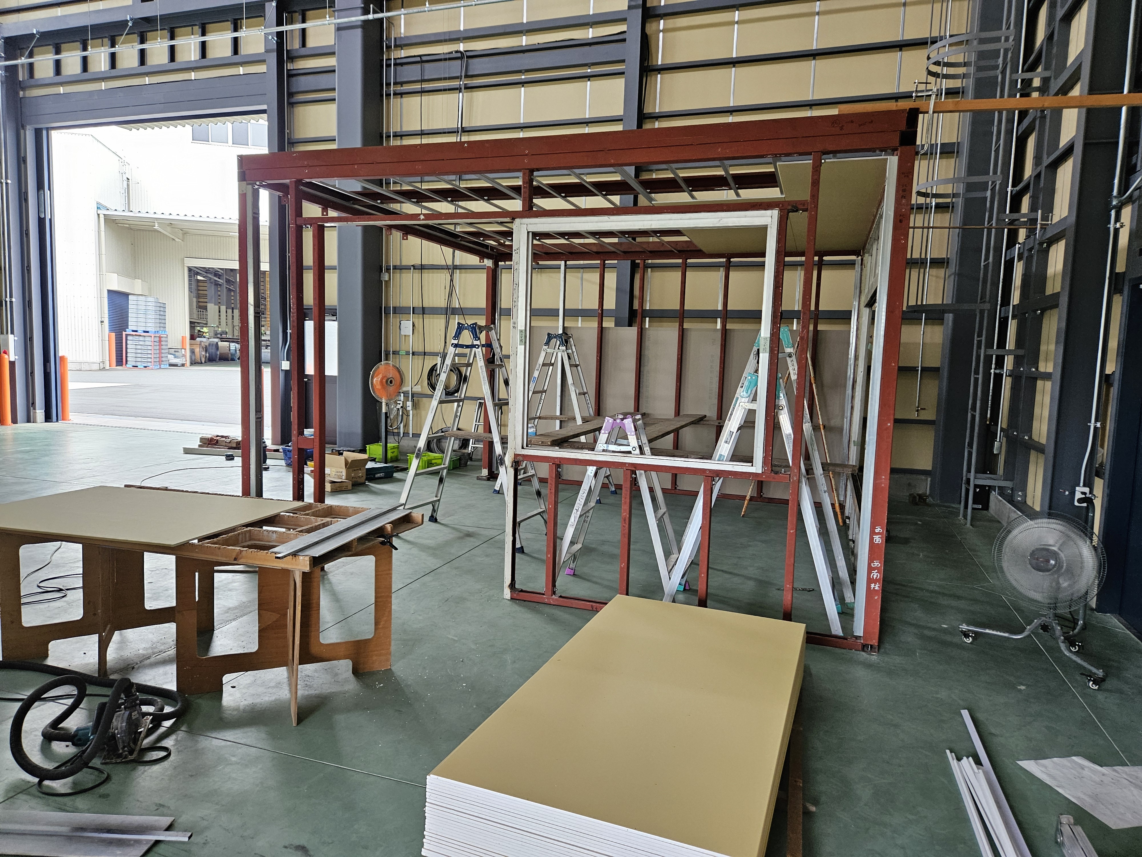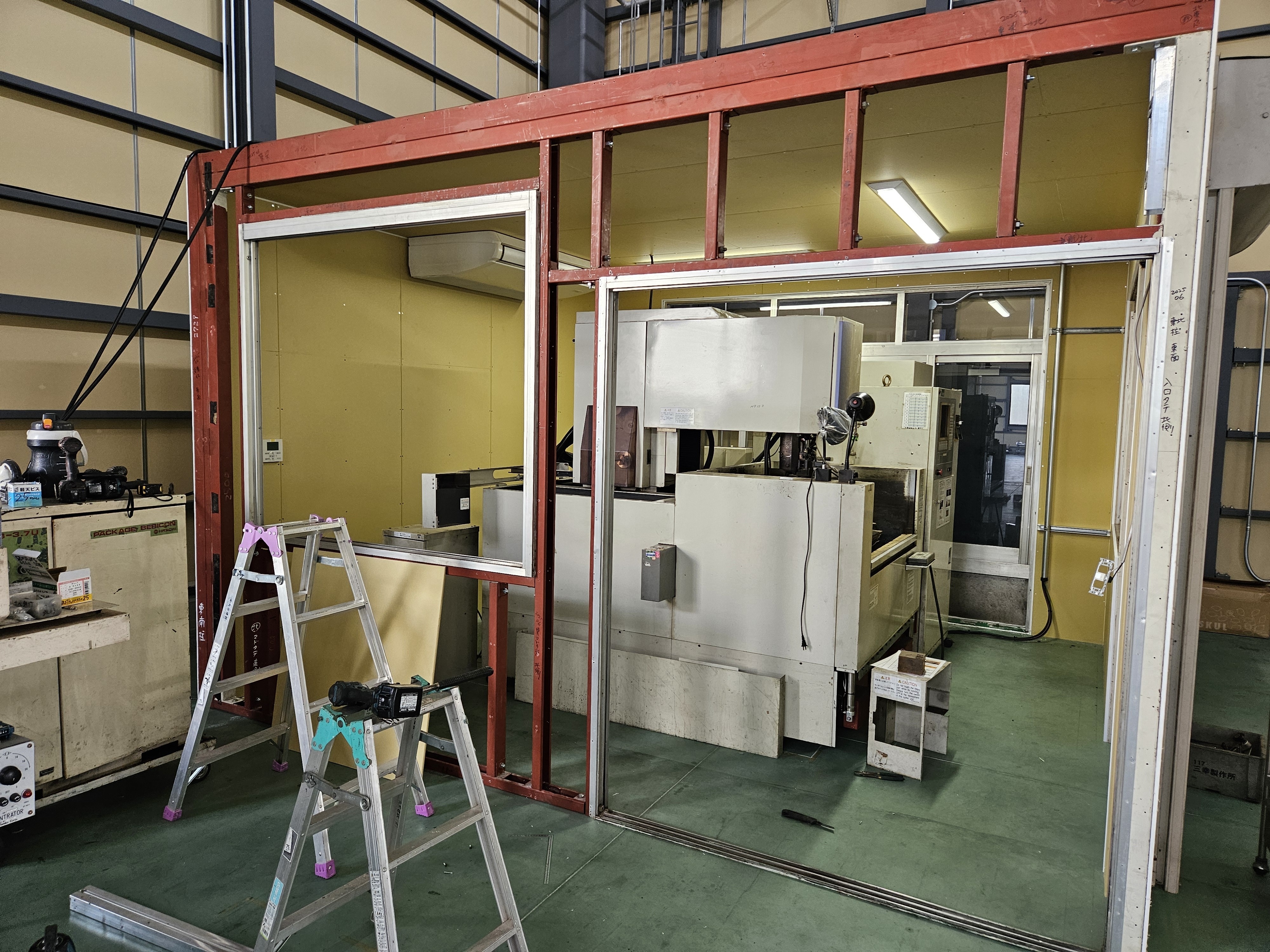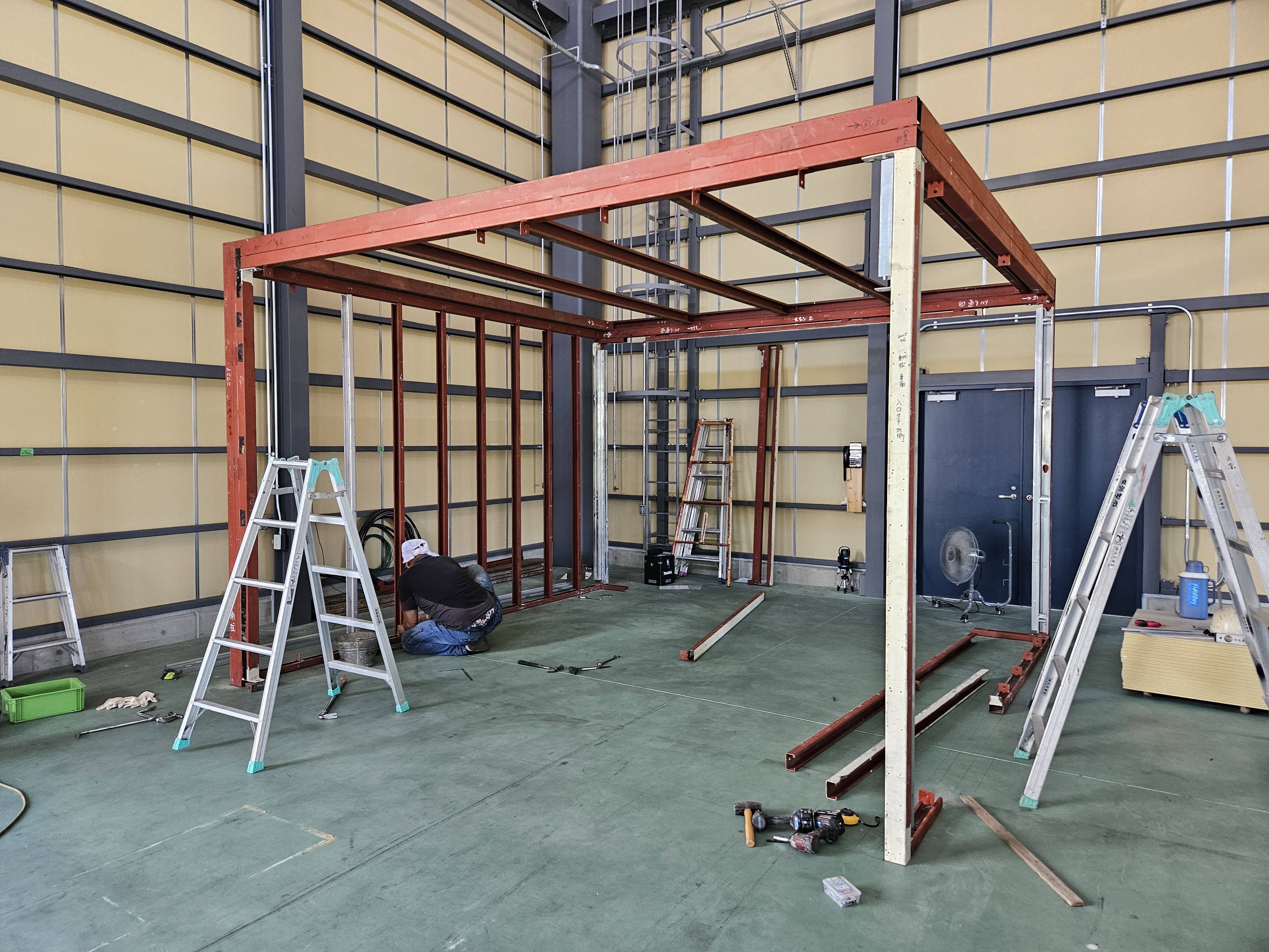 後日、検査機械が搬入されたので残された壁面を施工します。鉄骨壁下地、サッシを組付けます。