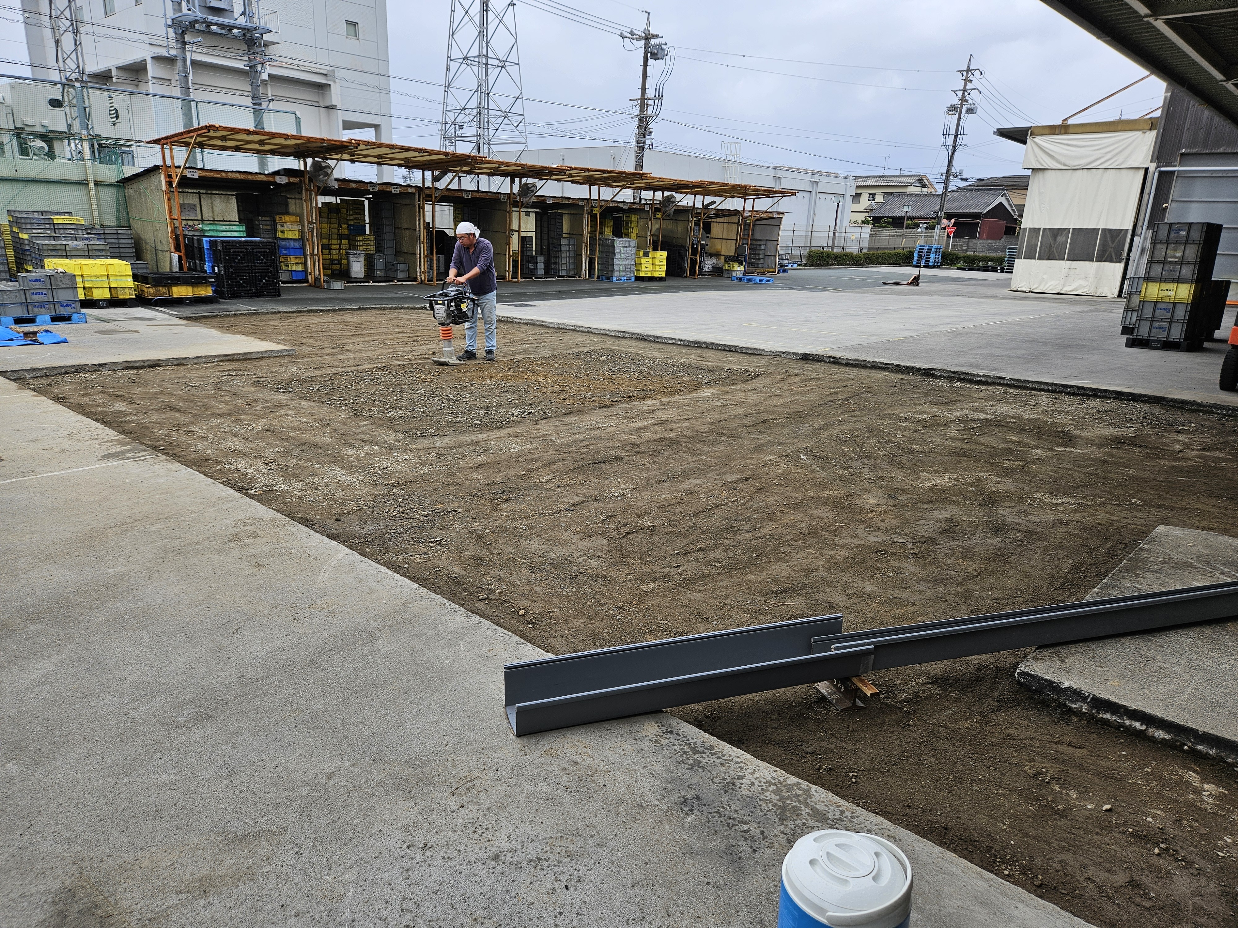 配置予定箇所の実測、整地、転圧、捨てコンのための型入れをします。